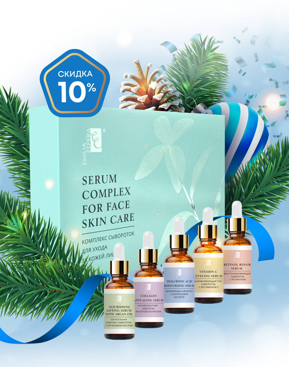 Приобретайте комплекс сывороток для ухода за кожей лица EMILIA ESPERA со скидкой 10 %!