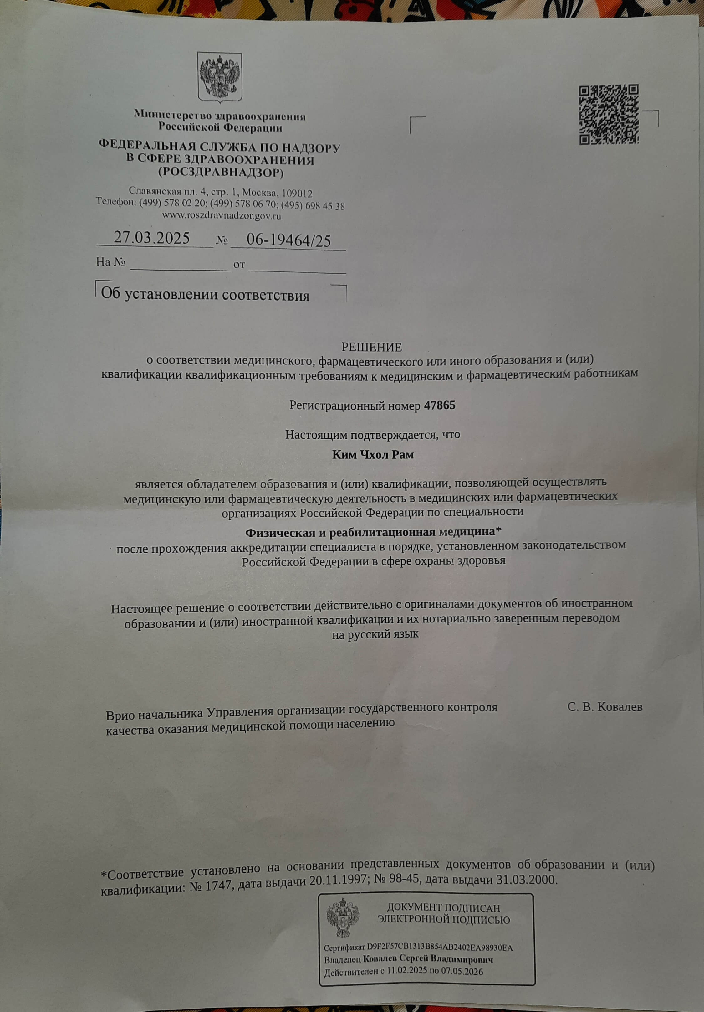 В настоящее время Ким Чхоль Рам является действующим врачом Традиционной восточной медицины в посольстве Кореи в Москве.